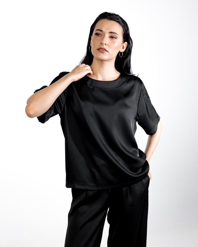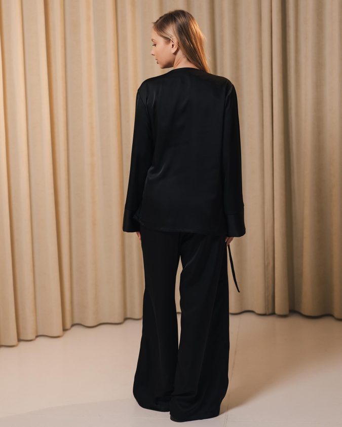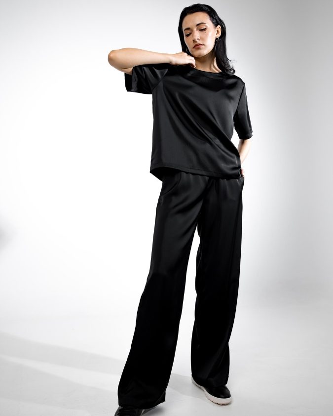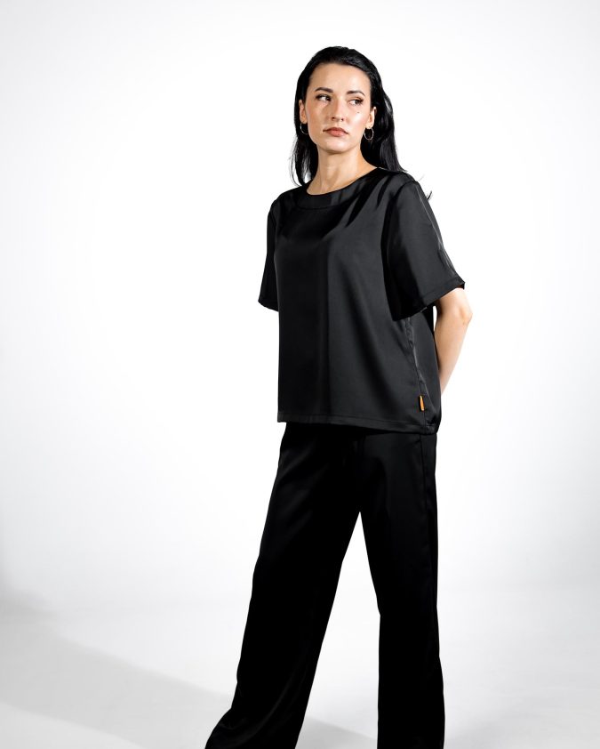 Костюм Grace із шовк-сатину — елегантний і комфортний комплект, що складається з футболки вільного крою та штанів із м’якою еластичною талією і зав’язками. Легка тканина з делікатним шовковим блиском приємна до тіла, майже не мнеться та забезпечує свободу рухів протягом усього дня.