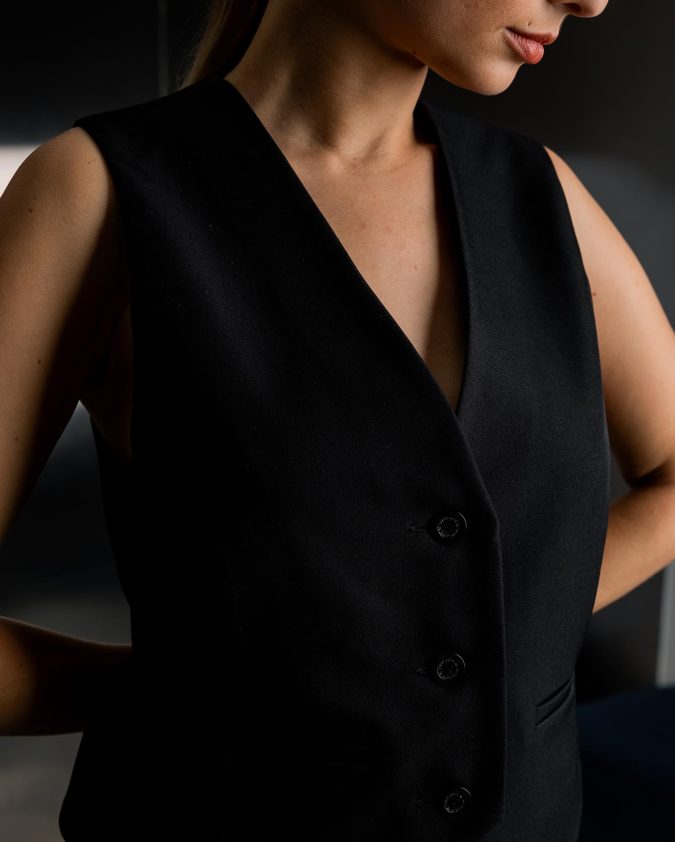 Жилетка Classic із чорної костюмної тканини - компонент костюма Classic. Лаконічний крій створює сучасний силует, а тканина добре тримає форму та забезпечує комфорт протягом усього дня. Ідеальний вибір для б’юті-майстрів, які цінують професійний вигляд і свободу рухів.