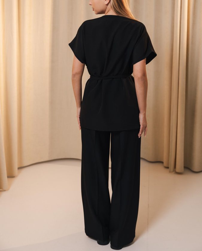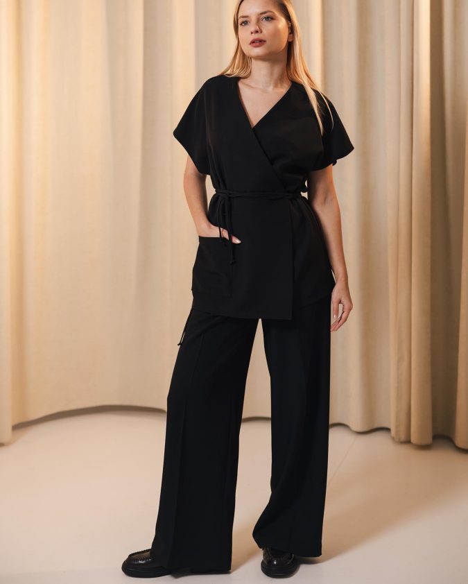 Костюм Classic із чорної костюмної тканини — елегантний комплект, що поєднує піджак, жилетку та штани палаццо. Лаконічний крій створює сучасний силует, а тканина добре тримає форму та забезпечує комфорт протягом усього дня. Ідеальний вибір для б’юті-майстрів, які цінують професійний вигляд і свободу рухів.