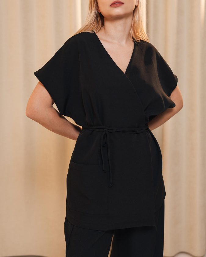 Kimono Long із чорної костюмної тканини - лаконічна та елегантна модель для роботи в б’юті-індустрії. Вільний крій oversize (one size), бічні зав’язки та приховані кнопки забезпечують комфортну посадку й свободу рухів протягом усього дня.