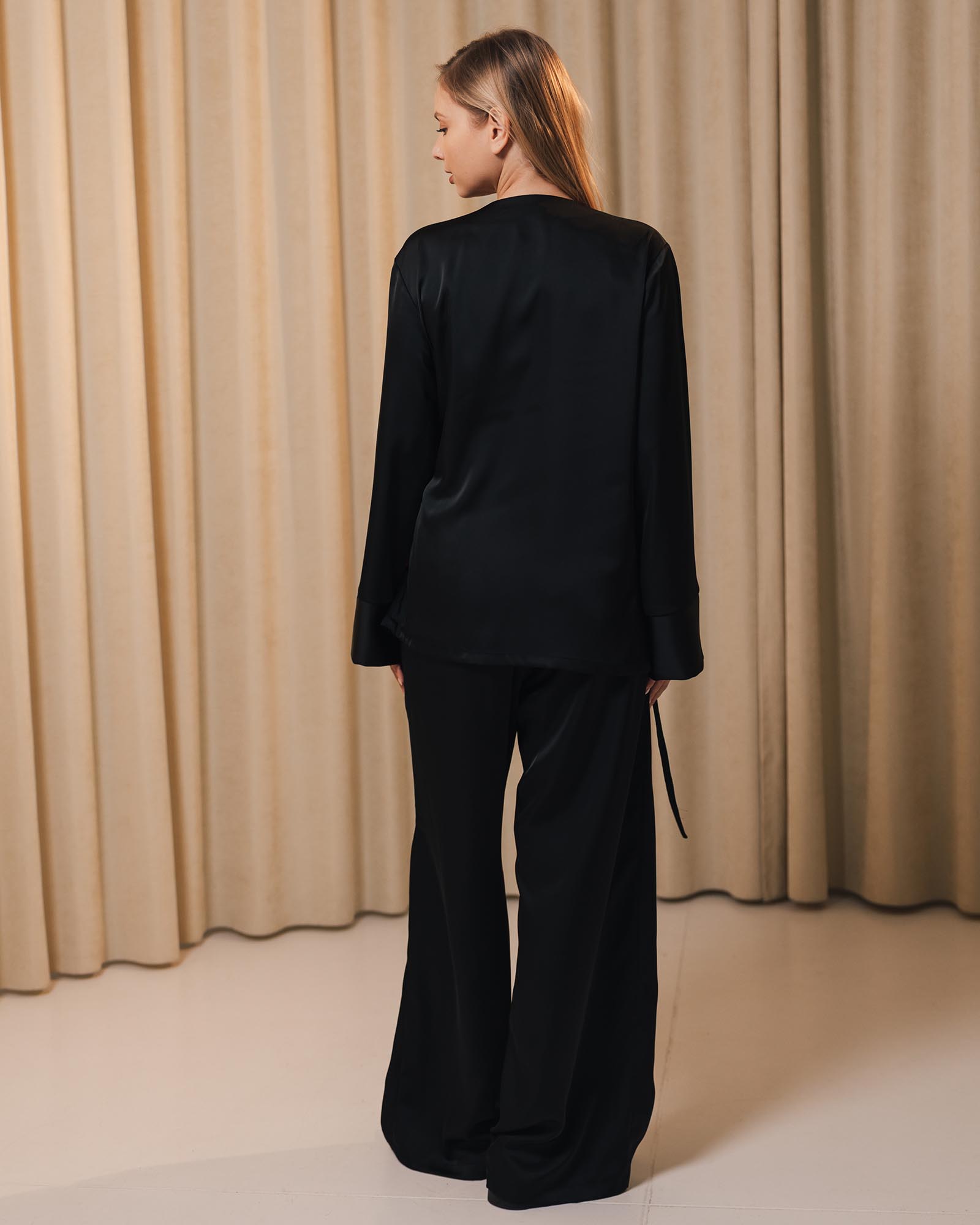Комплект складається з кімоно на запах, яке дозволяє регулювати посадку та формує витончений силует. Такий крій виглядає лаконічно та водночас підкреслює елегантність образу.