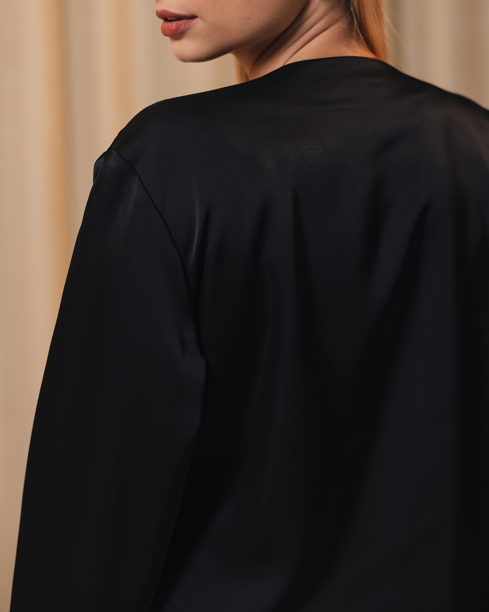 Модель виконана з гладкого сатину глибокого чорного кольору. Тканина має м’яку текстуру та благородний делікатний блиск, що надає образу елегантності та підкреслює акуратний професійний стиль. Матеріал приємний до тіла, добре пропускає повітря та забезпечує комфорт навіть під час тривалого робочого дня.